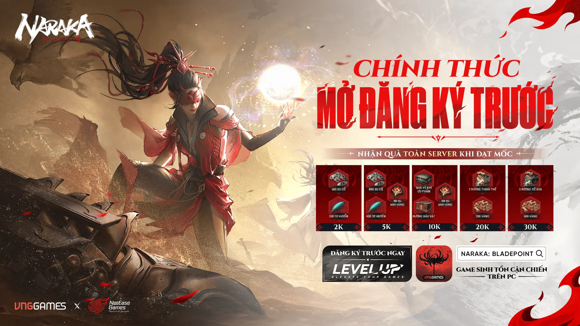 NARAKA: Bladepoint - siêu phẩm game sinh tồn cận chiến trên PC từ NetEase đã chính thức mở đăng ký trước trên nền tảng Level Up từ 22/12 đến hết ngày 28/12 này. Hãy nhanh chóng truy cập vào trang và đăng ký trước trò chơi để mở khóa các mốc quà tặng toàn server khi sản phẩm ra mắt.